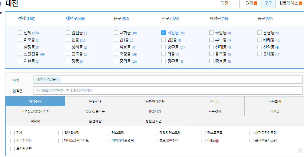 - 구를 선택하면 구에 포함된 동들이 표시되는데요. 대덕구를 선택하면 갈전동, 대화동, 덕암동, 목상동, 문평동, 미호동, 법동, 법1동, 법2동, 부수동, 비래동, 삼정동 등 대덕구에 소속된 동들이 표시됩니다. 이 중 아르바이트 구하기를 원하는 동을 선택해 줍니다. 원하는 동을 고르고 희망하는 업종이 있다면 선택해줍니다. 업종은 외식음료, 유통판매, 문화여가생활, 서비스, 사무회계, 디자인, 교육강사 등 다양한 업종이 있습니다. 업종을 선택한 다음 세부 직종을 선택합니다. 덕암동의 외식음료 중 패스트푸드를 세부 검색 내용으로 선택해보겠습니다.