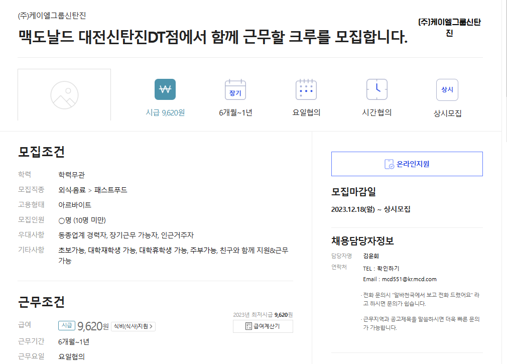 - 채용 공고를 누르면 아래와 같이 모집조건과 근무조건, 모집 마감일, 채용담당자 정보(성명, 연락처, 이메일) 등이 표시됩니다. 채용 담당자의 연락처나 이메일을 통해 연락을 한 뒤 세부 근무조건을 잘 조율한 후 상호 조건이 일치되면 아르바이트를 시작하면 됩니다.
